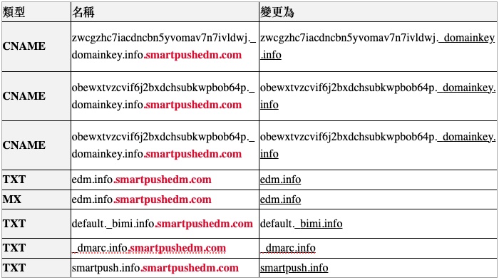 範例:DNS 記錄,域名地址為 info.smartpushedm.com